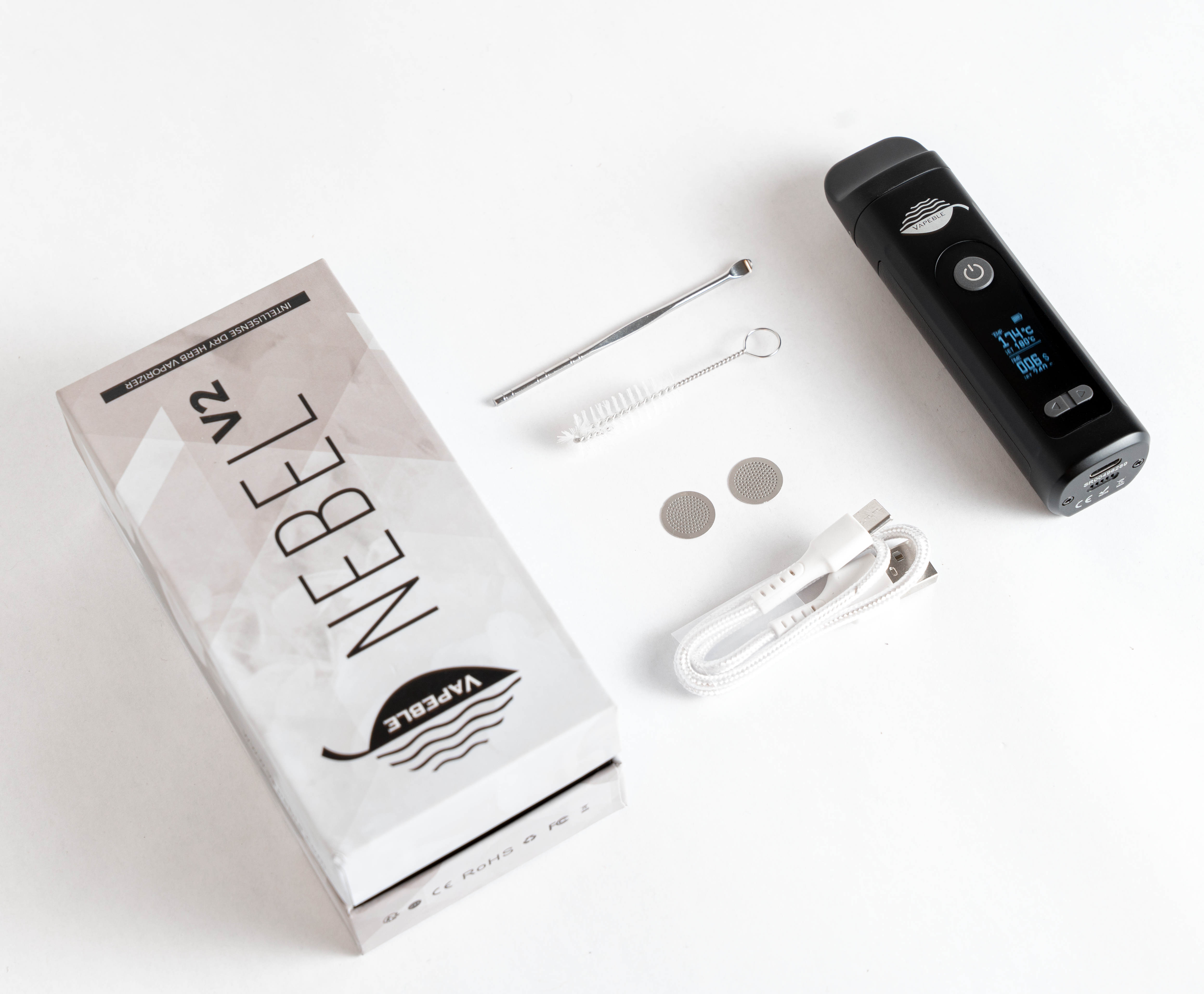 We deliver the Dry Herb Vaporizer in neutral packaging. Scope of delivery: Vapeble Nebel V2 including battery, 2x replacement screens, cleaning brush, tamper, USB Type-C cable and instructions. Dosing capsules, filters, seals and mouthpieces can be reordered.